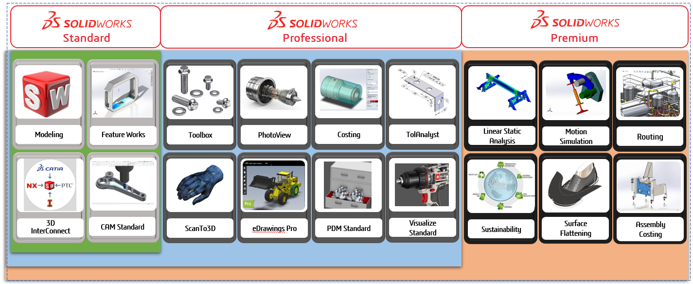 Sự khác biệt về tính năng giữa các gói bản quyền là yếu tố quyết định đến mức giá mua SOLIDWORKS 2026. SOLIDWORKS bản quyền có 03 gói chính là Standard, Professional và Premium.